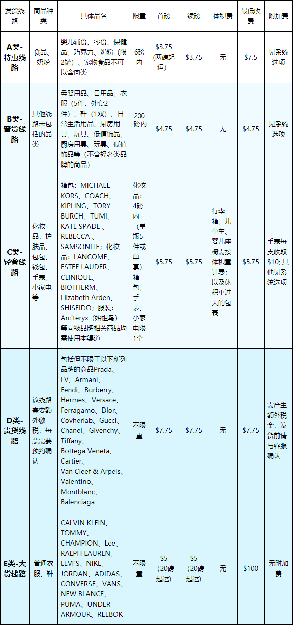 | C类-轻奢线路 | 化妆品,护肤品、包包、钱包、手表、小家电等 | 箱包:MICHAEL KORS、COACH、KIPLING、TORY BURCH、TUMI、KATE SPADE 、REBECCA 、SAMSONITE;化妆品:LANCOME、ESTEE LAUDER、CLINIQUE、BIOTHERM、Elizabeth Arden、SHISEIDO;服装:Arc'teryx(始祖鸟)等同级品牌相关商品均需使用本渠道 | 化妆品:4磅内(单瓶5件或单套)箱包、手表、小家电限1个 | $6.25 (两磅起运) |